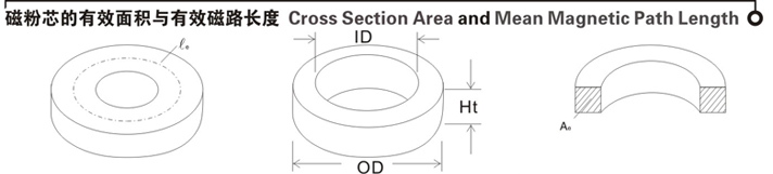 ![]() | Ae:有效磁粉芯面積(cm2)與磁芯的橫截面積相等(cross section area) le:有效磁路長度或稱平均磁路長度(cm)(mean magnetic path length) V:磁芯體積:(cm3)(core volume) OD:磁芯外徑(cm)(outside diameter of core) ID:磁芯內(nèi)徑(cm)(inside diameter of core) Ht:磁芯高度(cm) W:磁芯最小窗口面積(cm2) 1英寸(inches)=103mil=25.4mm |